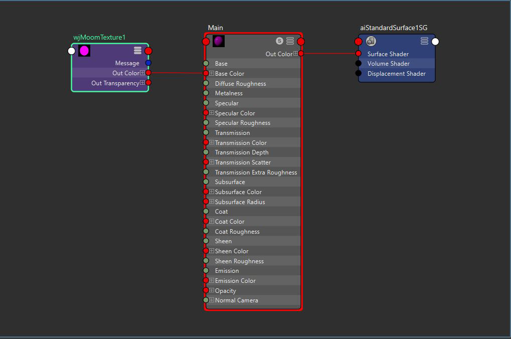 Also for wjMoomtexture.osl. The OSL is then brought into the scene through the hypershade and the node output of wjMoomtexture.osl is plugged into the base color of the AIStandardSurface.