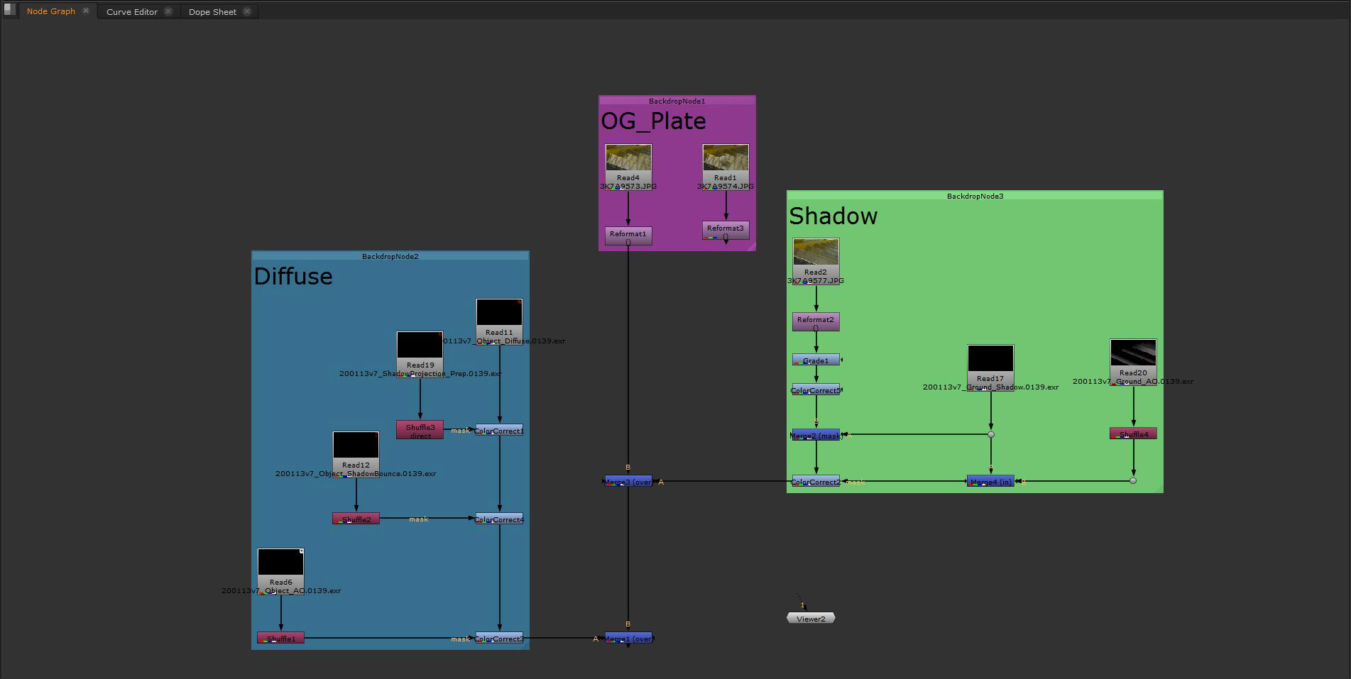 The shadow was used to mask out from the reference shadow. However, when it was merged the shadow had more blue than expected. I think it had happened as the weather of the outside also changed when taking the shadow plate. So I had to match the shadows of the clean plate.